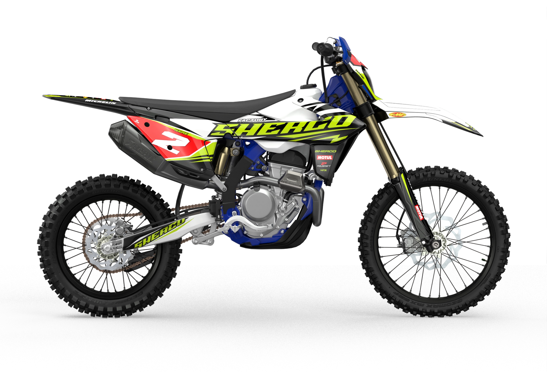 Sherco SE enduro Factory dirt bike graphics in blue, grey and yellow colors White#color_white